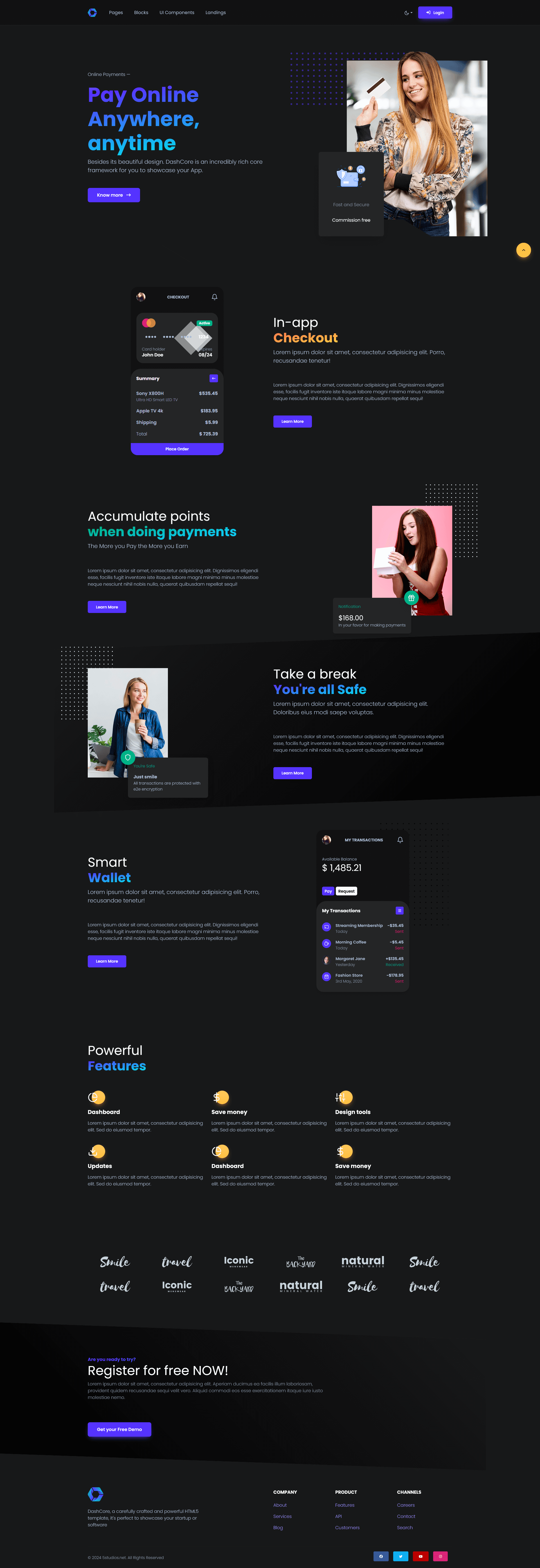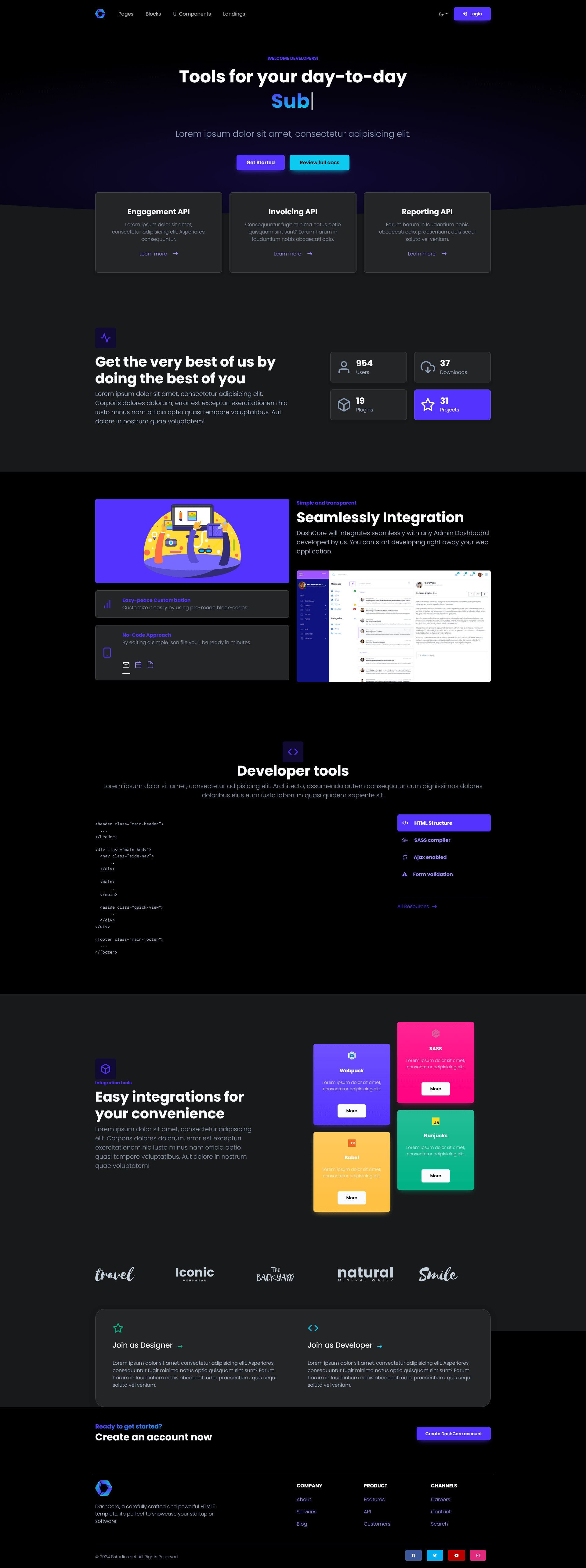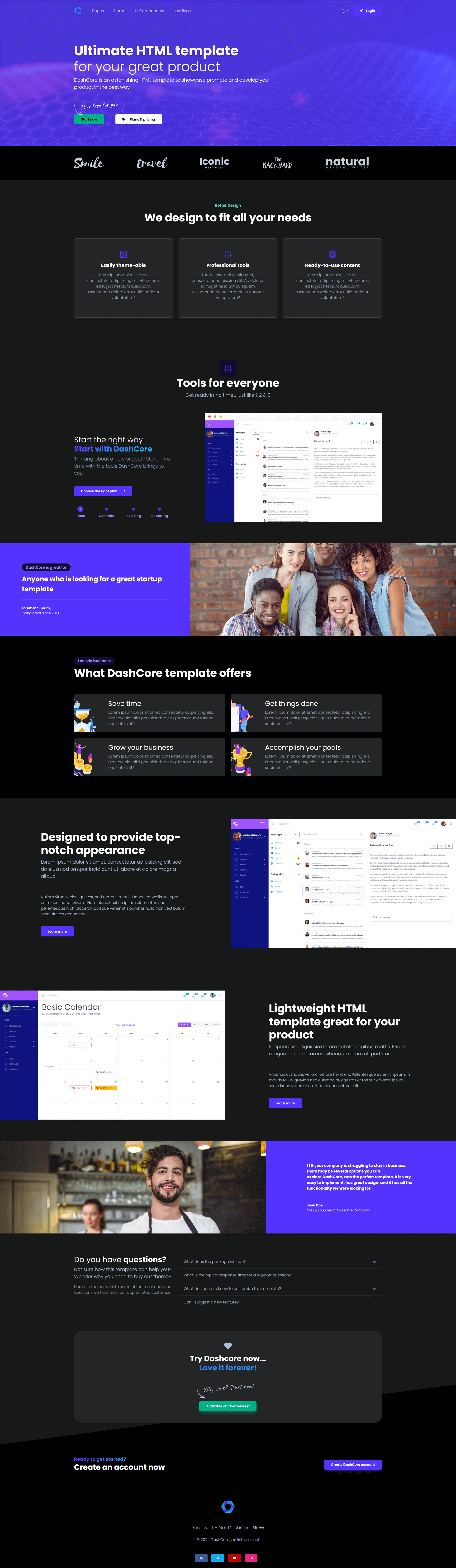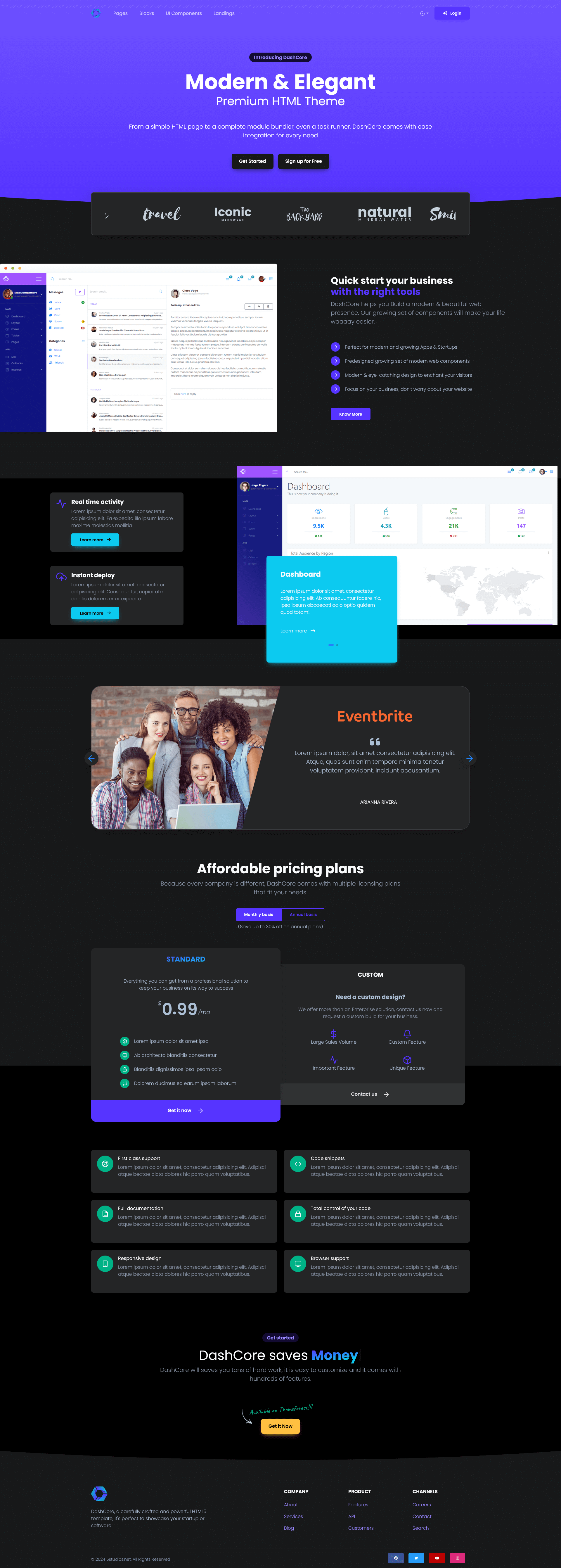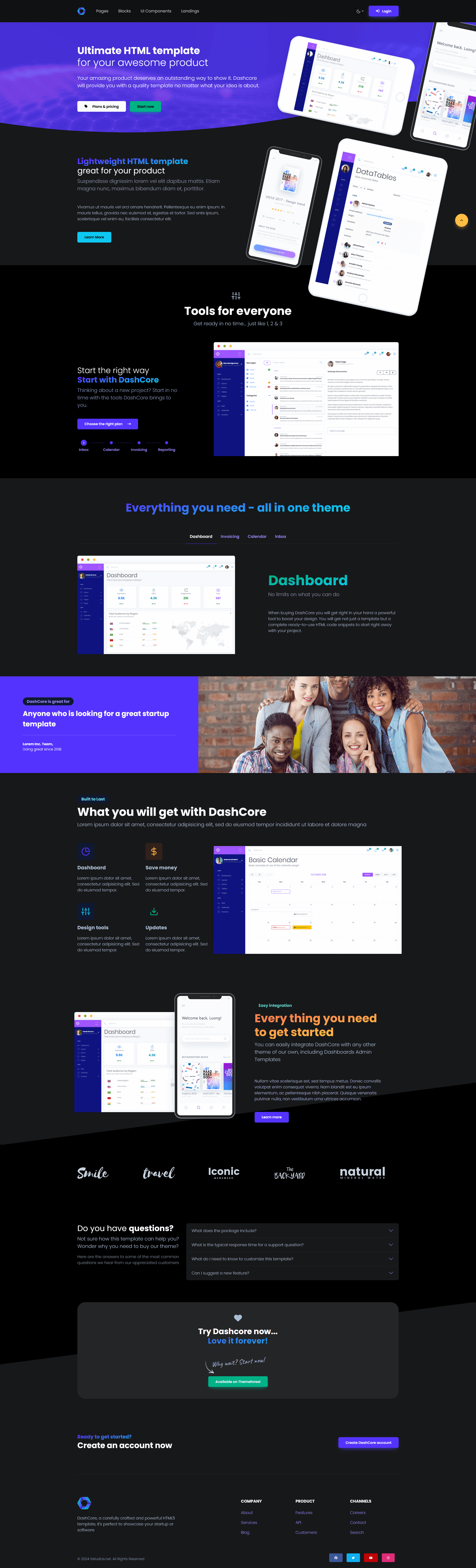 When buying DashCore you will get right in your hand a powerful tool to boost your design. You will get not just a template but a complete ready-to-use HTML code snippets to start right away with your project.